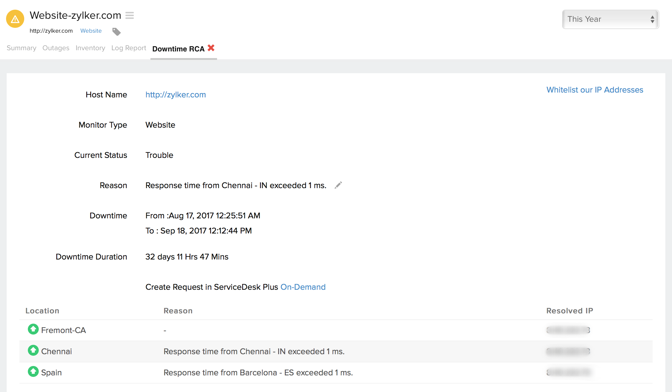 This section shows you the current status of your website when polled from the Primary and Secondary monitoring locations. This will have downtime details, duration, and location wise reason for the outage.