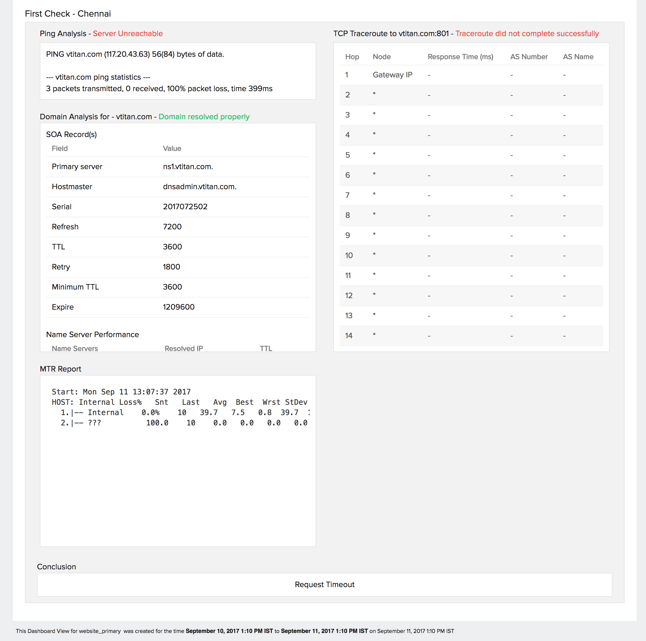 This is where the RCA report tells you the probable reason for the outage instance based on the above results. The conclusion reached in this case is “Connection to the server got dropped in the Hop 16”. This is obviously something to do with the network. Armed with this conclusion, you can immediately get down fixing the issue.