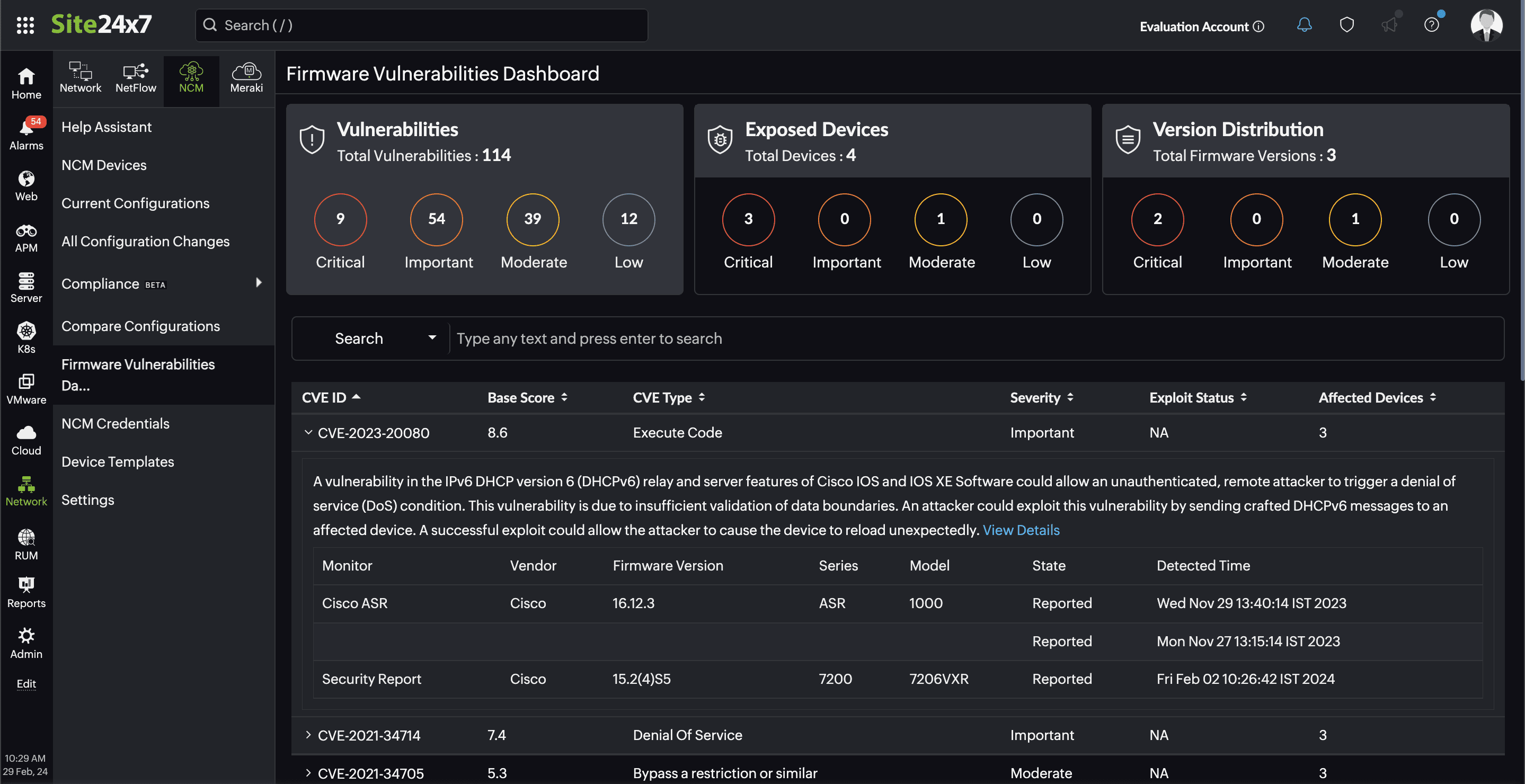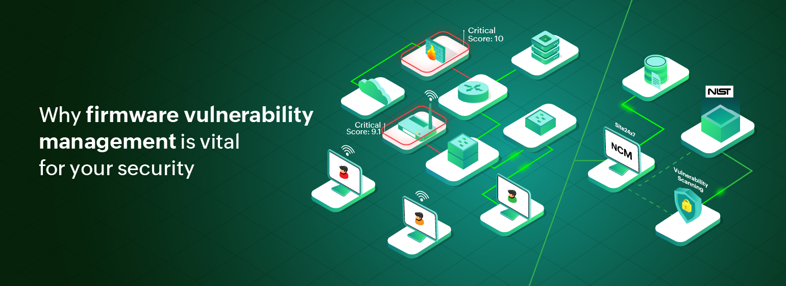 Tracking firmware vulnerabilities is like finding a needle in a haystack, only more tedious. That's why it's crucial to switch to an automated firmware vulnerability management tool like Site24x7, which offers firmware vulnerability management as part of its network configuration manager.