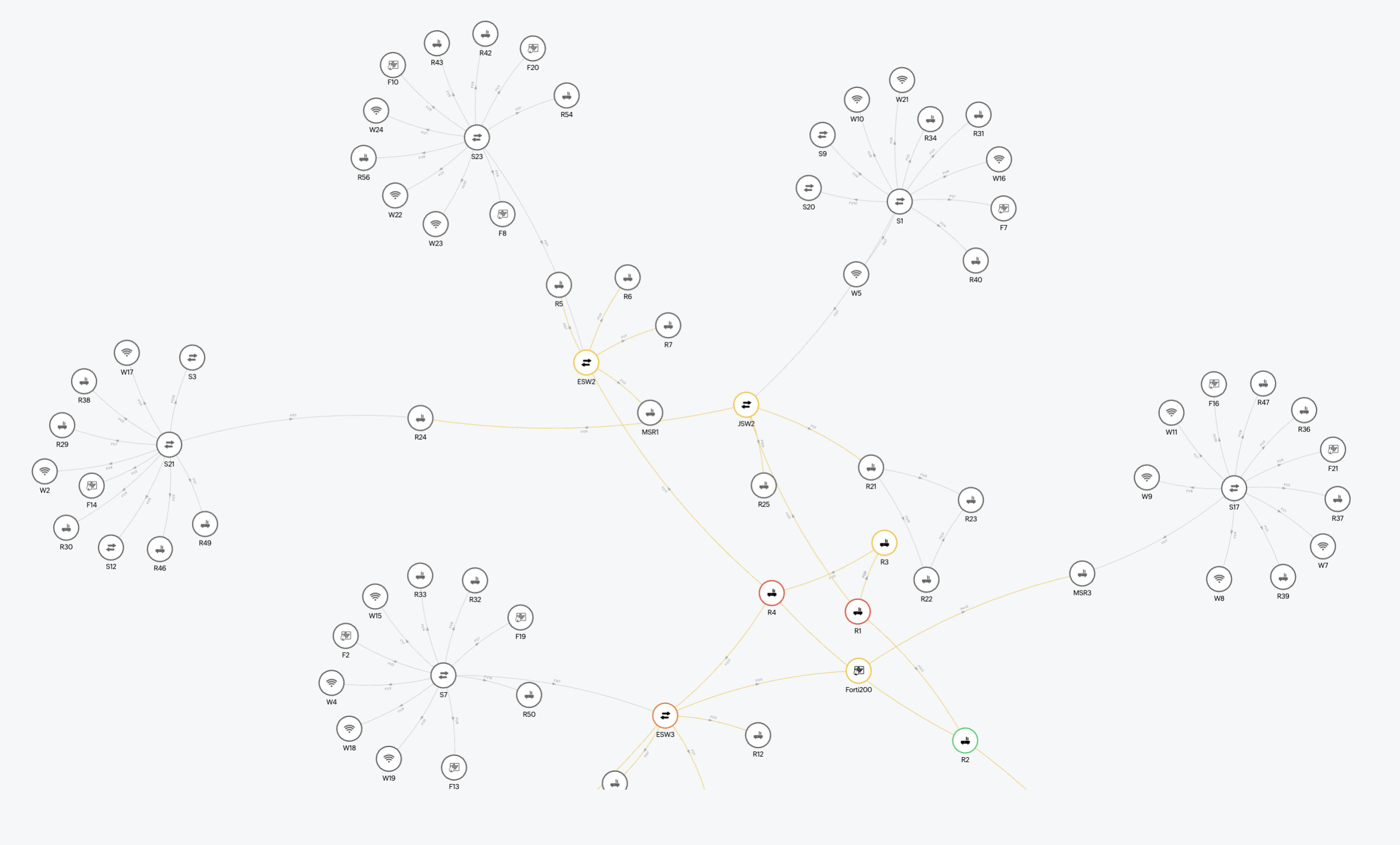 Get a clear picture of relationships between devices by identifying all communication between them. The interface connections between devices are also displayed as colored links based on their current state, and you can view their configuration details as well. This helps you quickly identify connectivity issues.