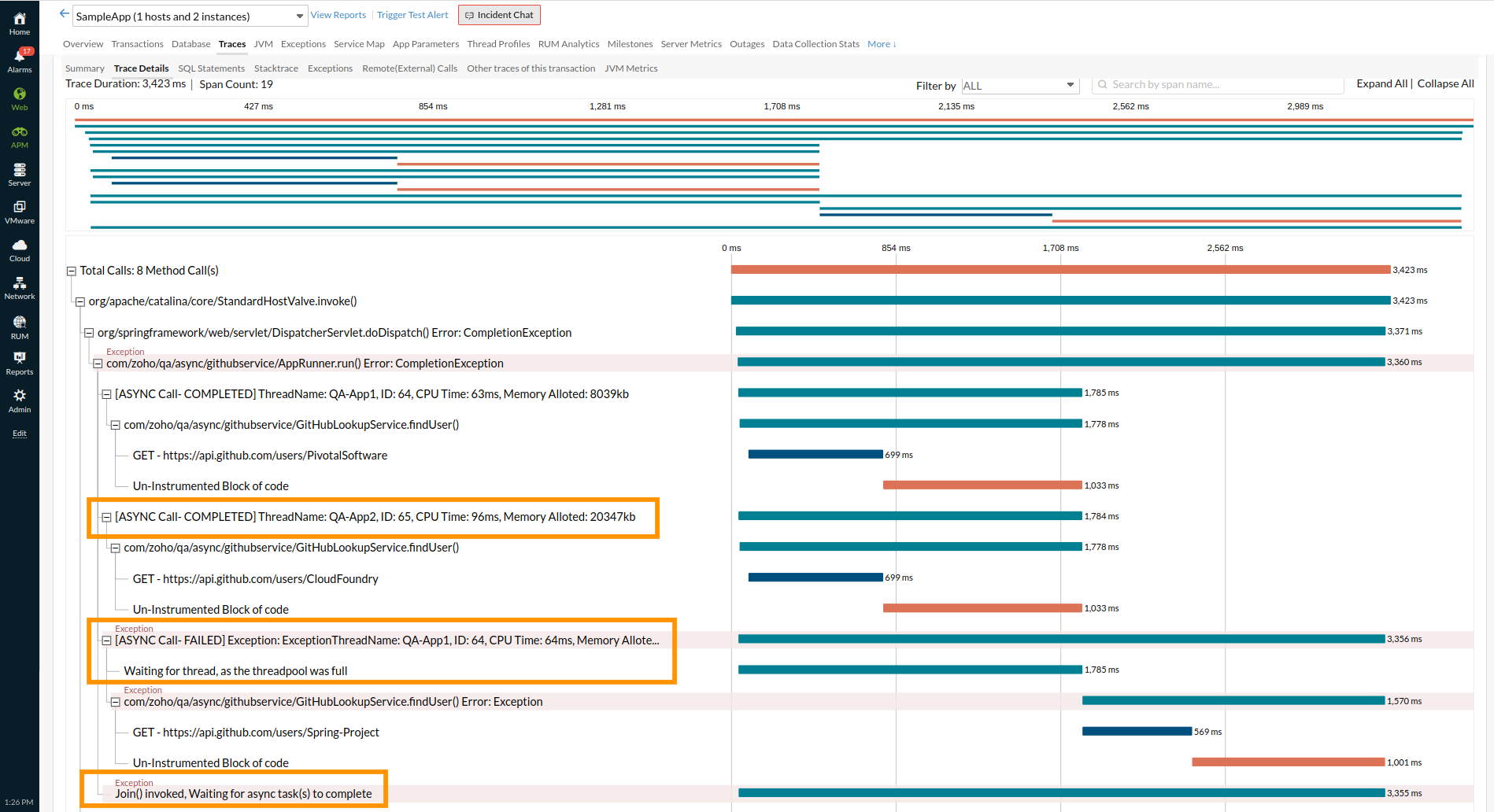 The Traces Details tab in Site24x7's APM Insight has been specifically designed to include async support, allowing users to easily instrument all types of applications, regardless of whether they are running synchronous or asynchronous code.