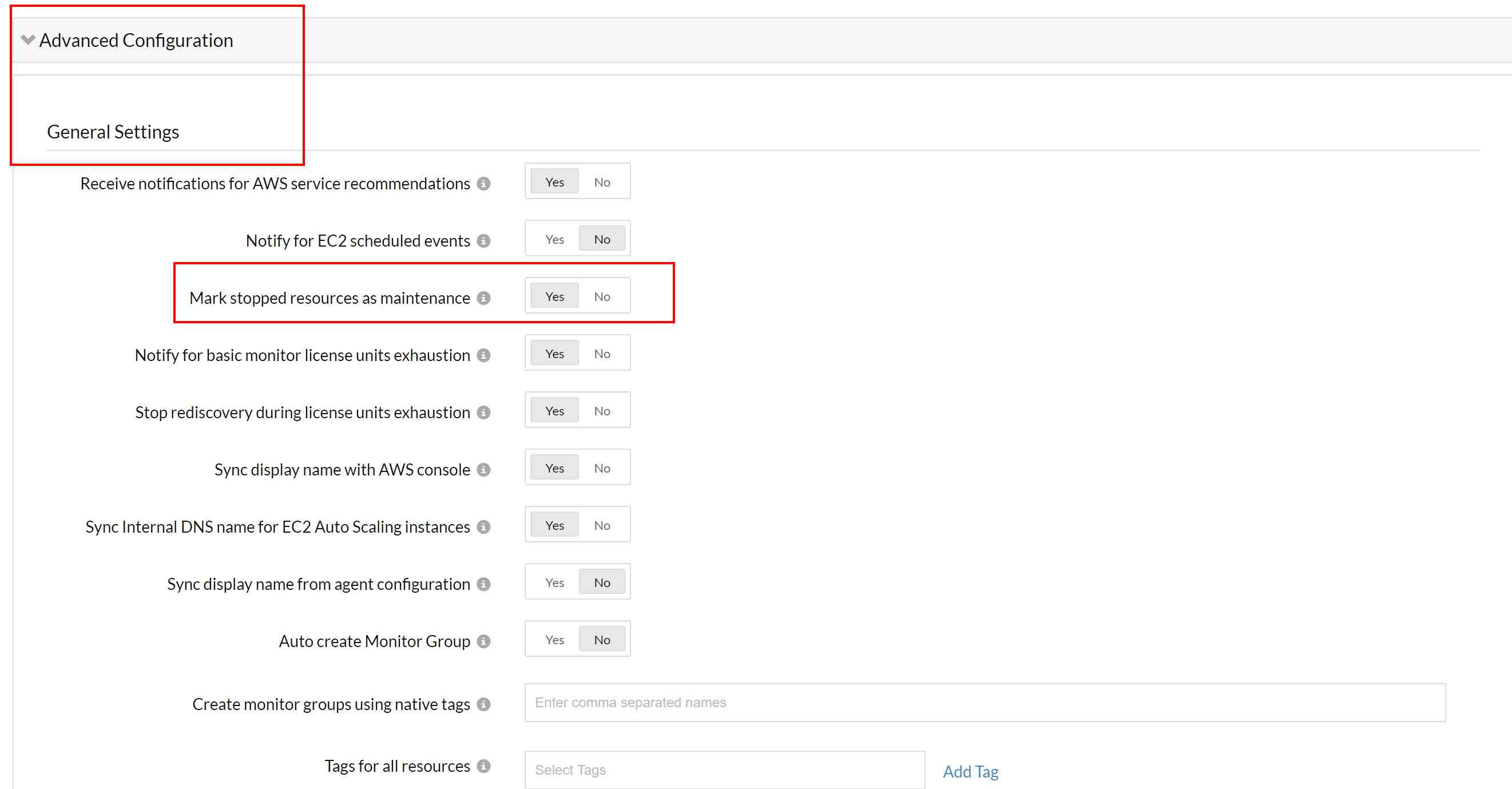 2. Scroll down a bit where you will find the Advanced Configurations > General settings. Toggle "Mark stopped resources as maintenance" to Yes and Save.