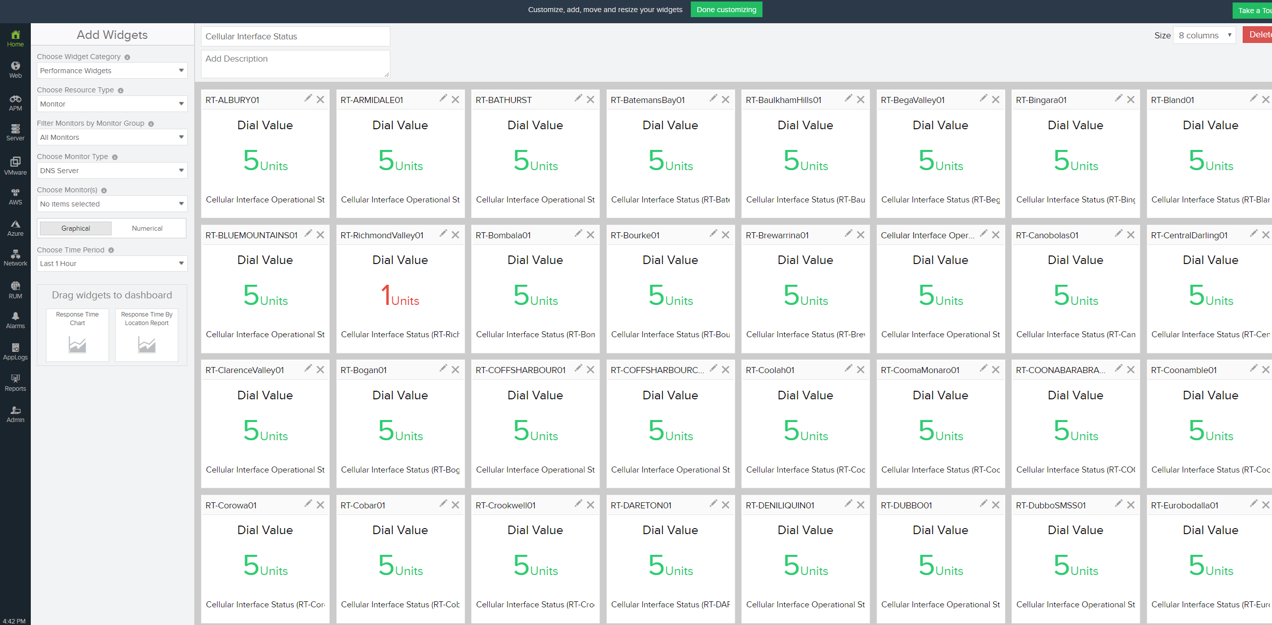 I am using a custom dashboard to display the status of a performance counter for all my routers. It shows me whether a router has failed over to a backup link or not. If the performance counter value is 5 (green), its normal and if its 1 (red) then its failed over to the cellular link. I have about 100 routers. Its very clumsy and very laborious to create such a dashboard. Needs lots of refinement. I have attached the screenshot of my dashboard and see how ugly it looks.