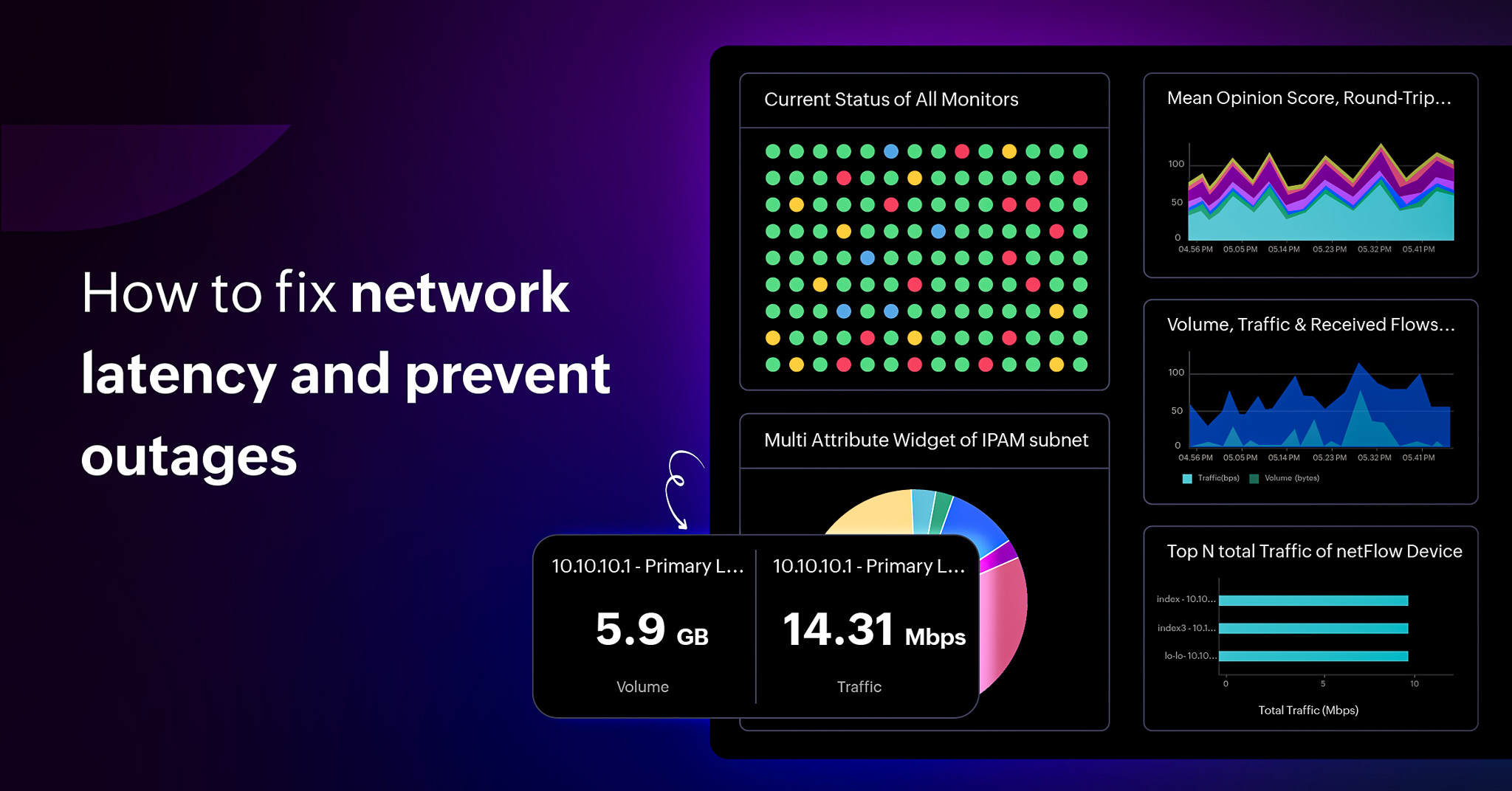 Network latency can arise from various factors, both controllable and uncontrollable. The key to resolving these factors lies in automating the identification of issues. Site24x7 identifies and addresses latency issues within a network by continuously monitoring traffic flows. It leverages AI to help you identify bandwidth hogs, malfunctioning network devices, and device configuration errors that contribute to latency.