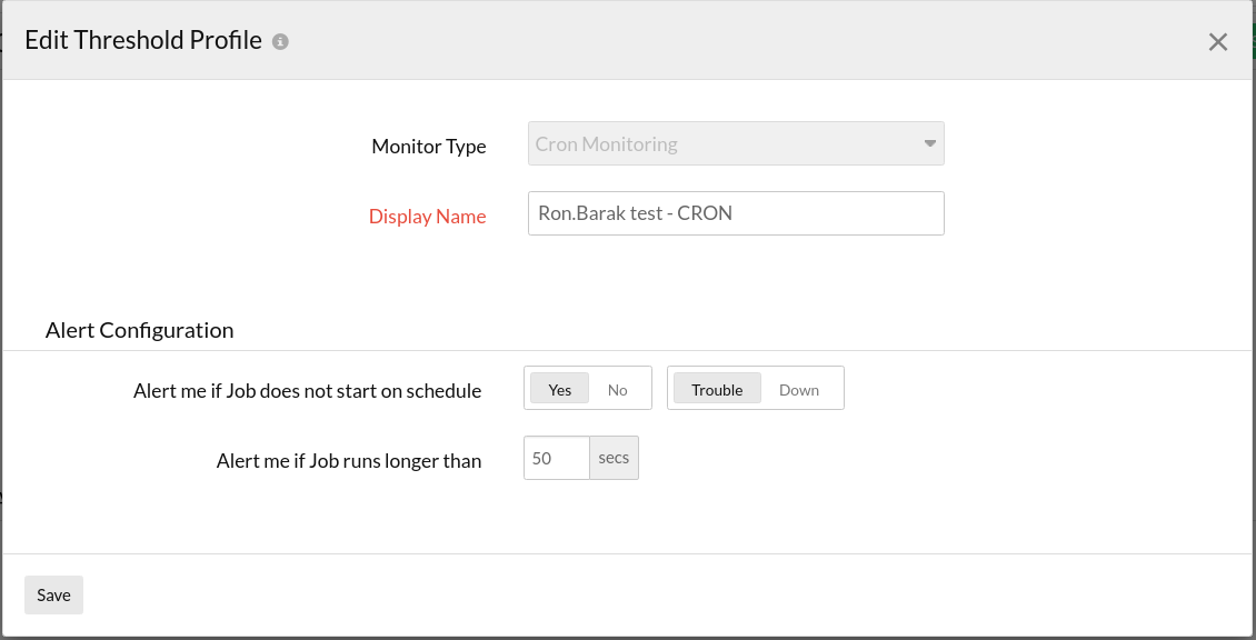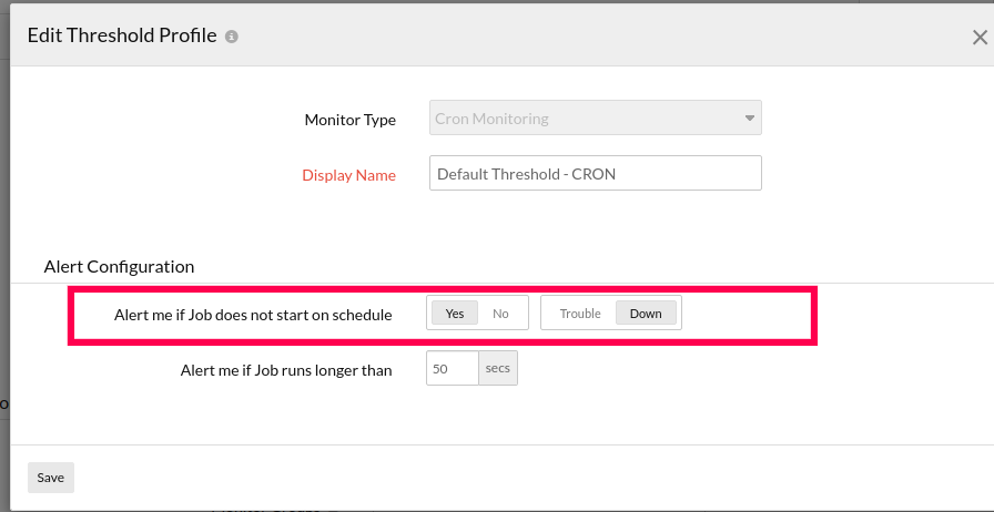 You can configure this threshold setting by navigating to cron monitor details page -> Click on hamburger icon -> Edit -> Threshold and Availability -> Click on pencil icon -> Alert me if Job does not start on schedule -> Trouble/Down