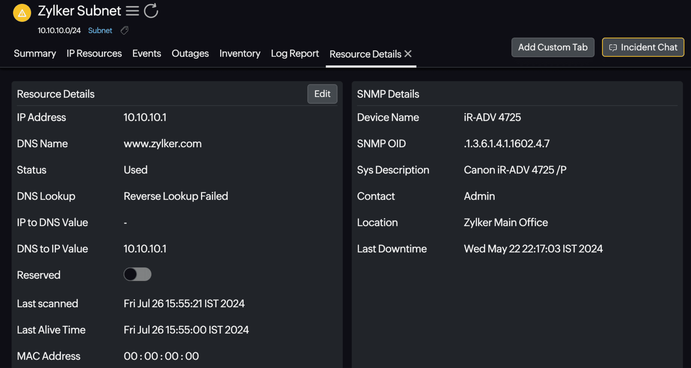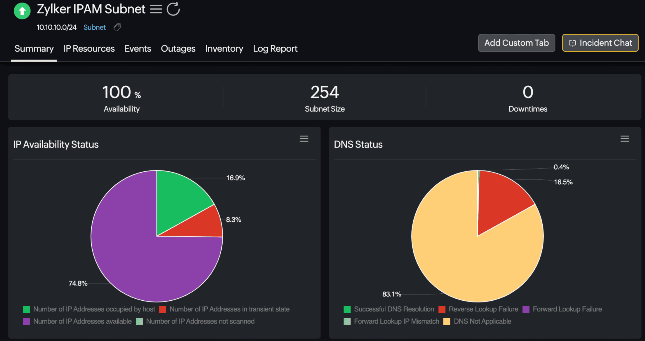 Start by adding any subnet within your organization. Additionally, suppose you have added all the routers present in your organization as network monitors. In that case, our IPAM tool will automatically scan the routing table to find and list the subnets, which can then be easily added as IPAM monitors. Site24x7 utilizes ICMP to assess the availability of IP addresses within the subnet. Then, our tool uses deep scanning to resolve the IP address and display its status.