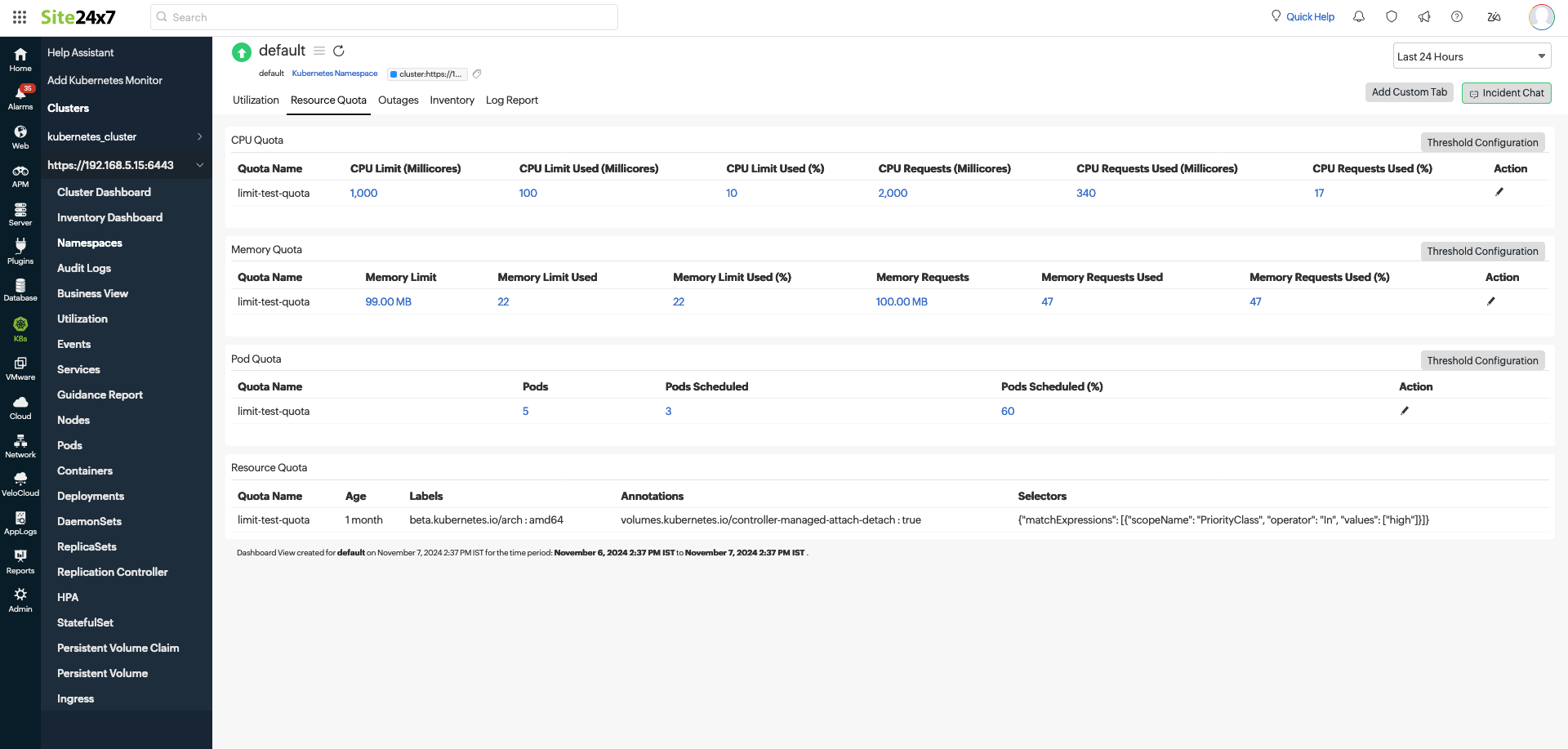 Monitoring resource consumption in Kubernetes is highly crucial for ensuring peak performance and preventing any unforeseen resource shortages or excessive usage. Site24x7 offers advanced monitoring of Kubernetes resource quotas, providing comprehensive insights into resource allocation across namespaces and keeping you updated on quota utilization in real time.