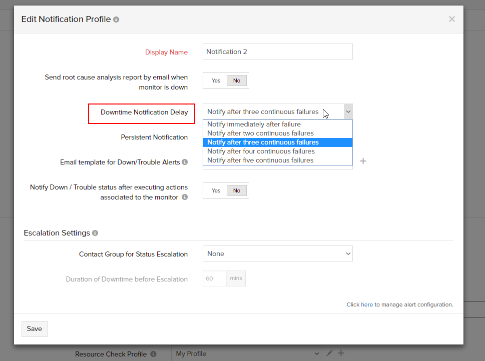 Goto -> server monitor -> click on the hamburger icon -> Edit -> Notification Profile -> Click on the Pen icon -> Downtime Notification Delay -> Select your delay.