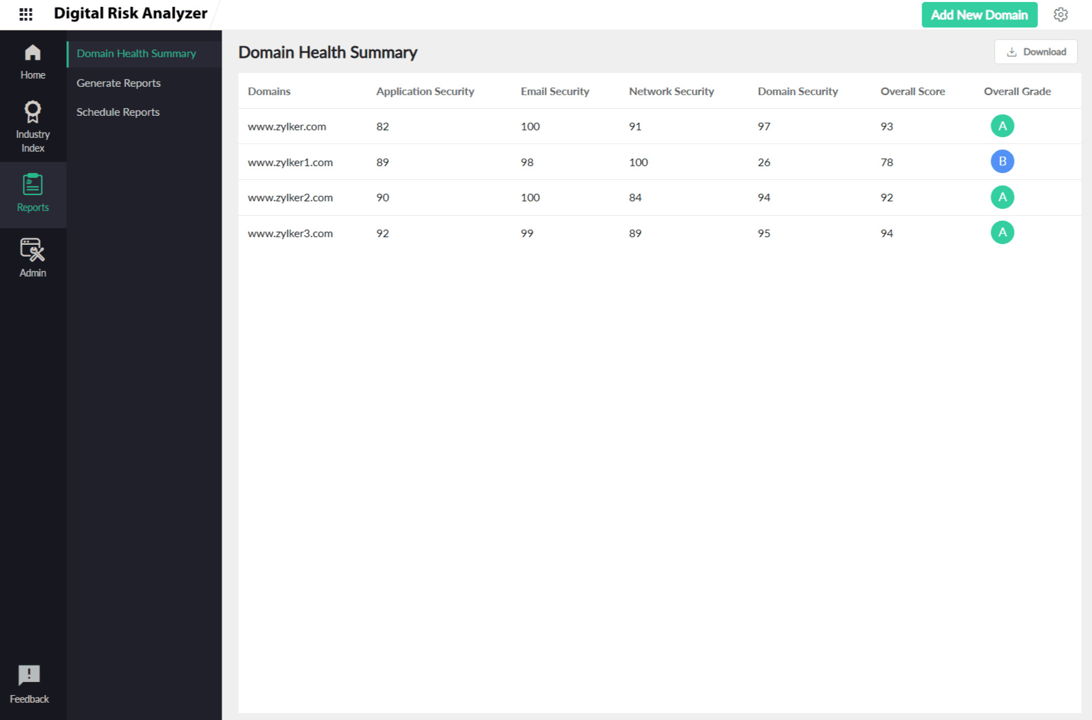 We are thrilled to announce our comprehensive Reports feature in Digital Risk Analyzer, which gives insights on your domain, network, application, and email security posture. You can generate detailed or consolidated reports for multiple domains to identify vulnerabilities and track overall security scores and grades. These reports can be scheduled, generated on demand, downloaded, or automatically delivered via email to keep you informed and proactive about your digital risks.
