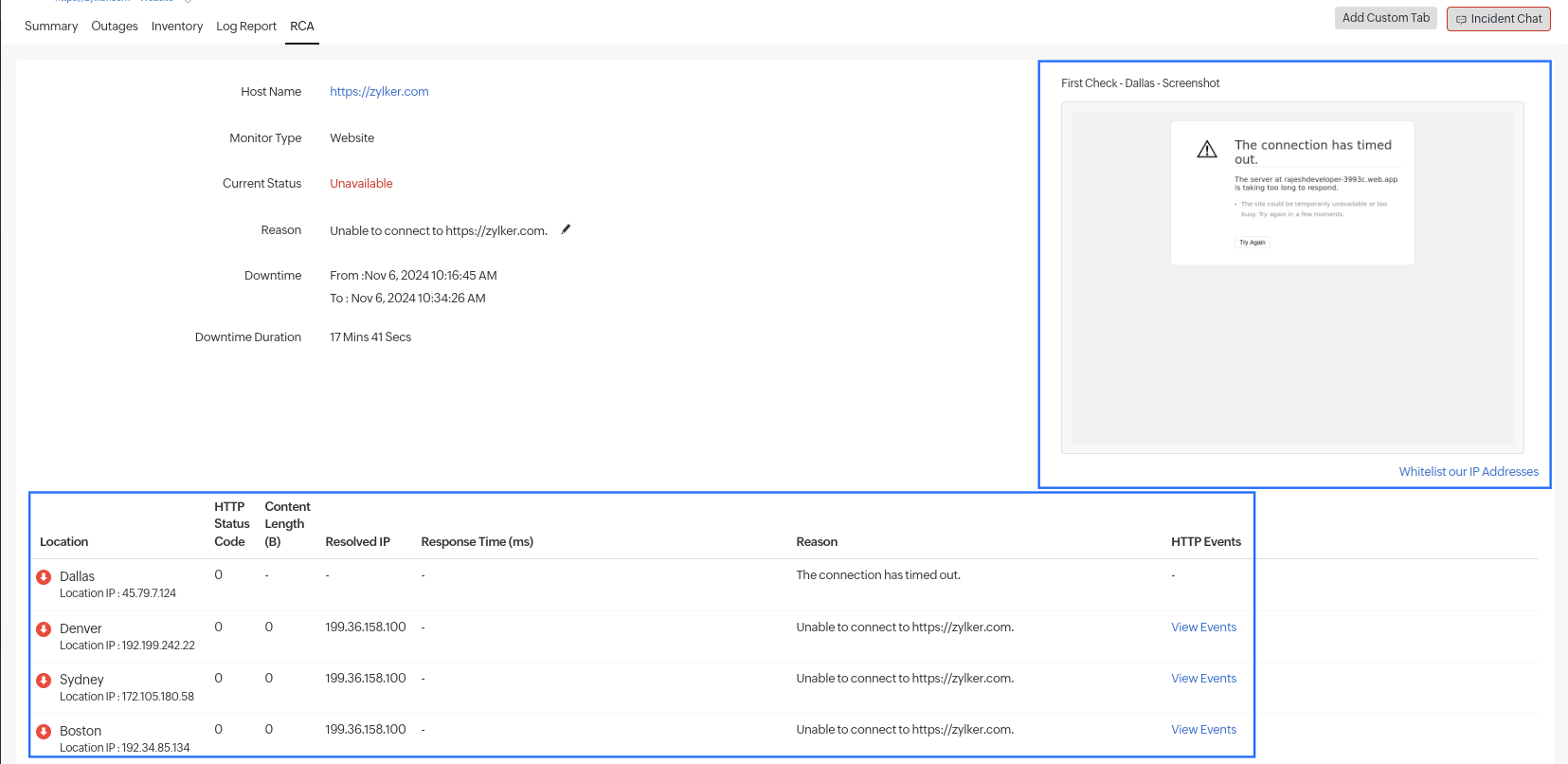 Site24x7's RCA feature captures visual snapshots of your website at the exact moment of downtime. They provide valuable insights into the nature of the issue. By analyzing these snapshots, you gain a better understanding of the root cause to take targeted corrective action.