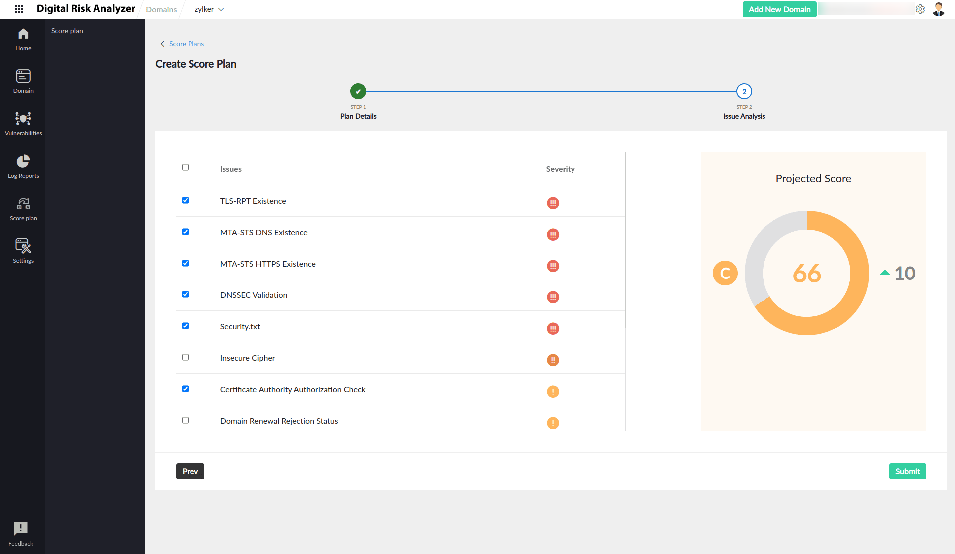 - View your current cybersecurity score along with the issues in your domains and vendor domains.