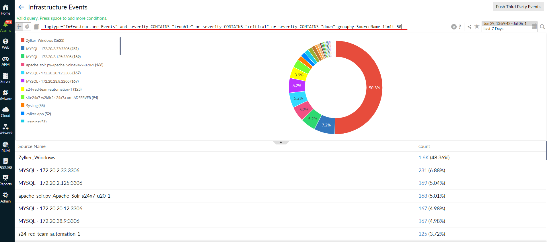 logtype="Infrastructure Events" and severity CONTAINS "trouble" or severity CONTAINS "critical" or severity CONTAINS "down" groupby SourceName limit 50