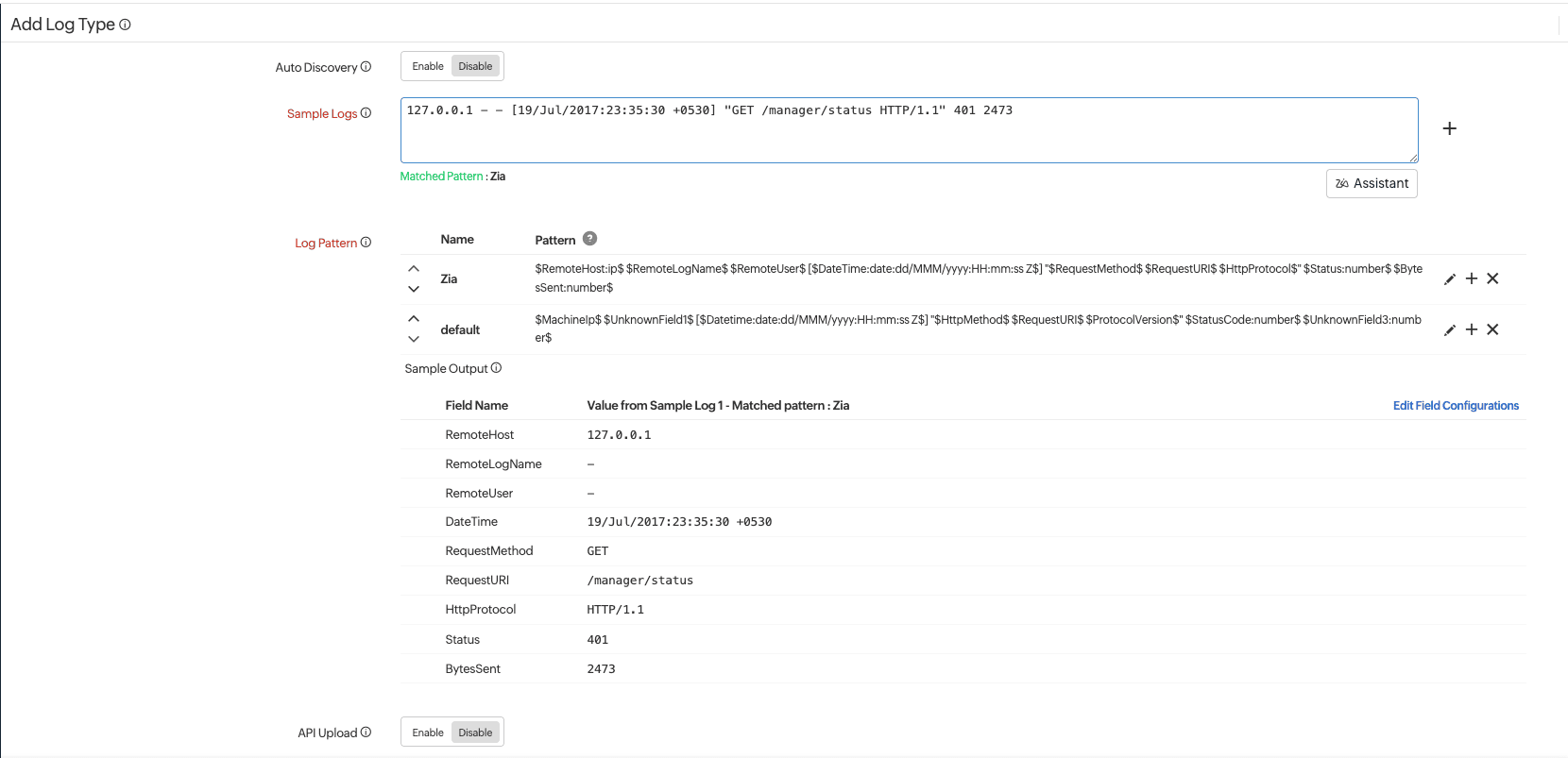 4. Click Ask Zia near the Sample Logs, provide the sample log pattern and click Generate.