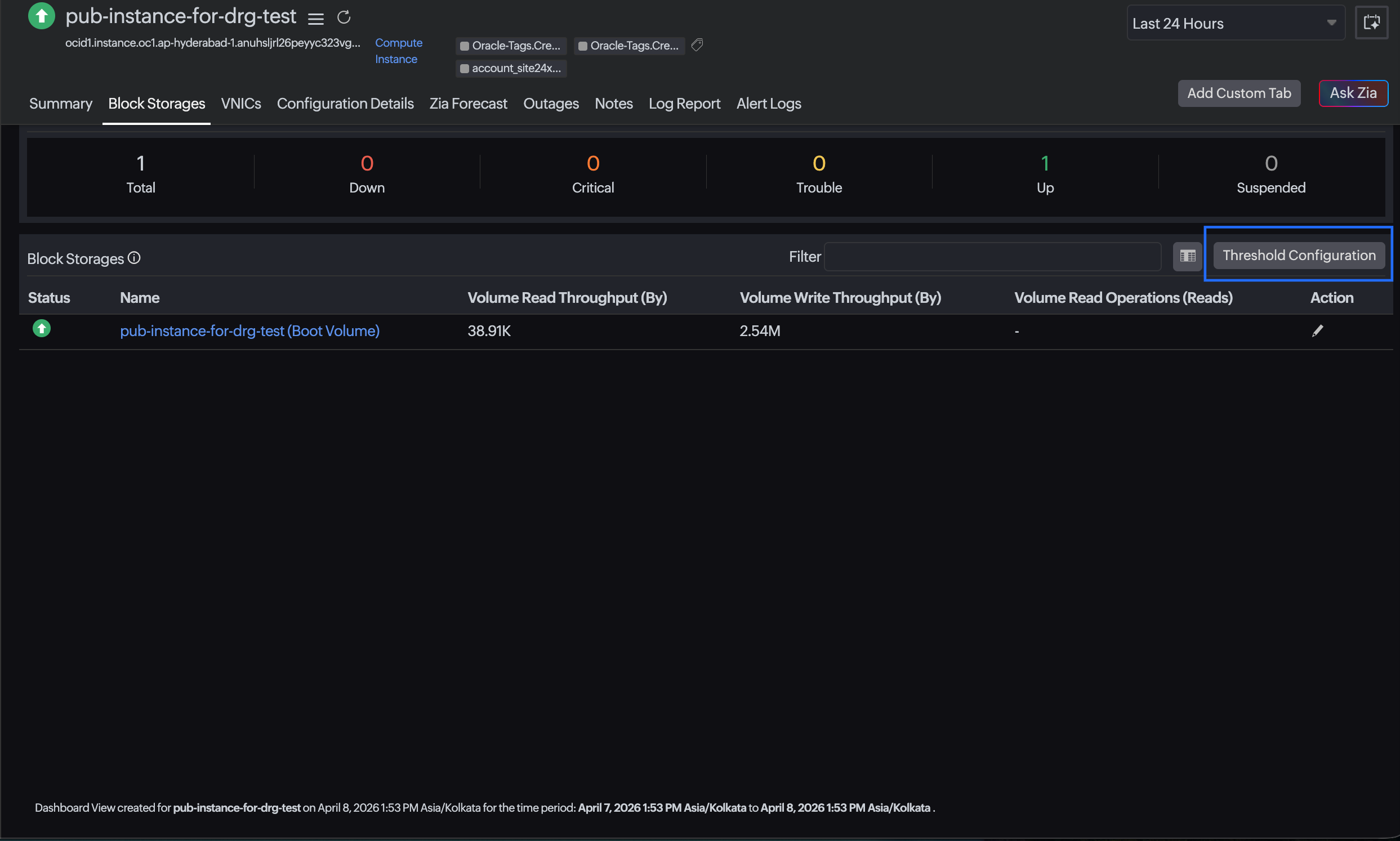 When a block volume enters a Trouble or Critical state, the status is automatically propagated to the Compute Instance monitor. This triggers an alert at the parent level, helping you identify storage-related performance issues without needing to inspect each volume individually.