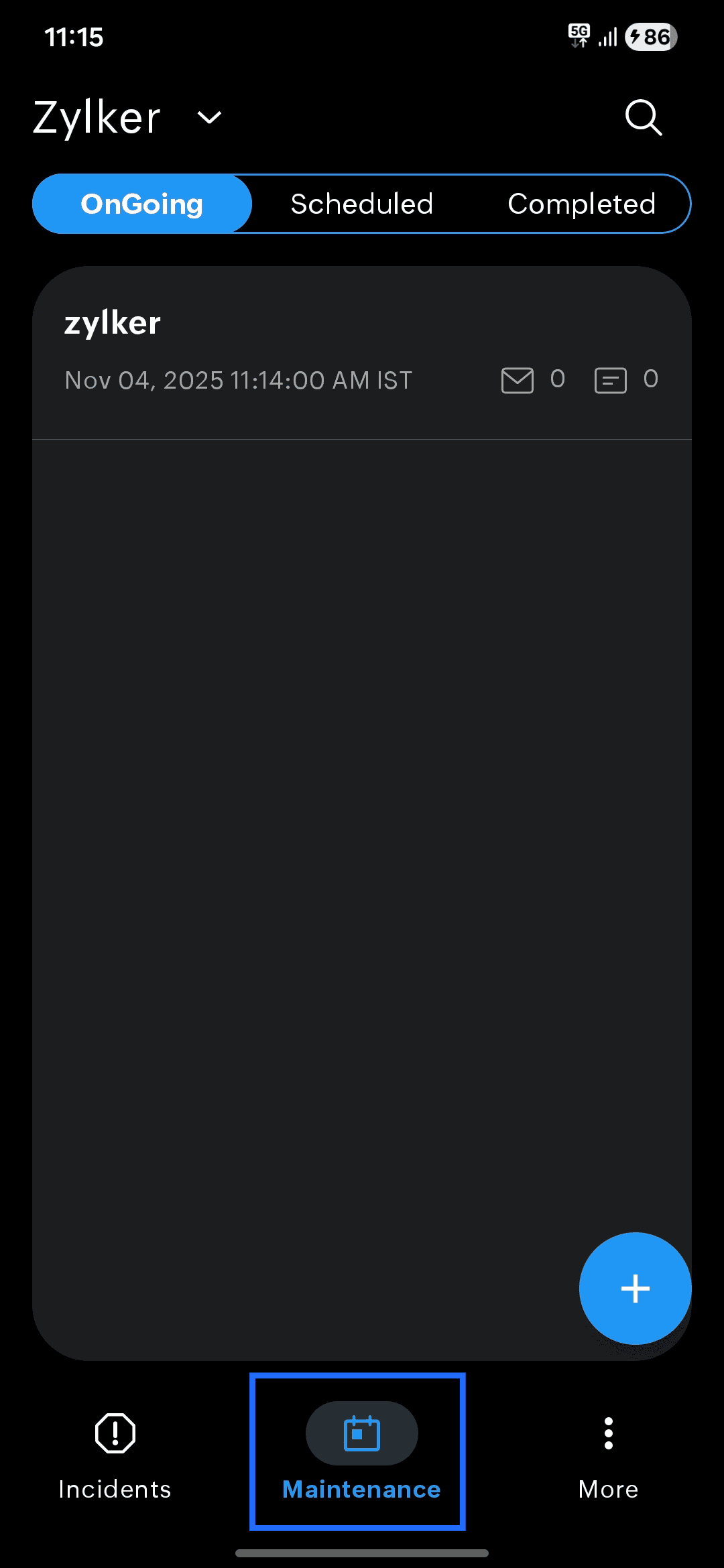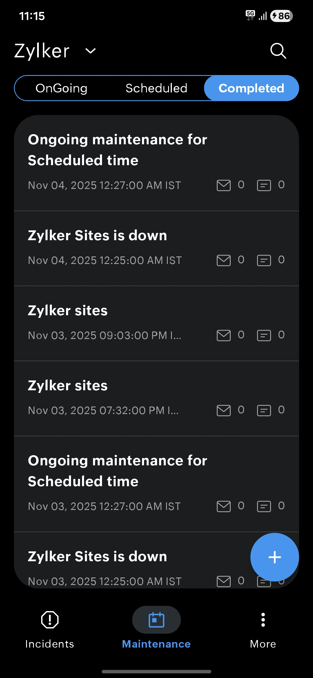 Switch to the Completed tab to view the list of the completed maintenance schedules for your status pages. Select individual maintenance title to drill down into the maintenance details.