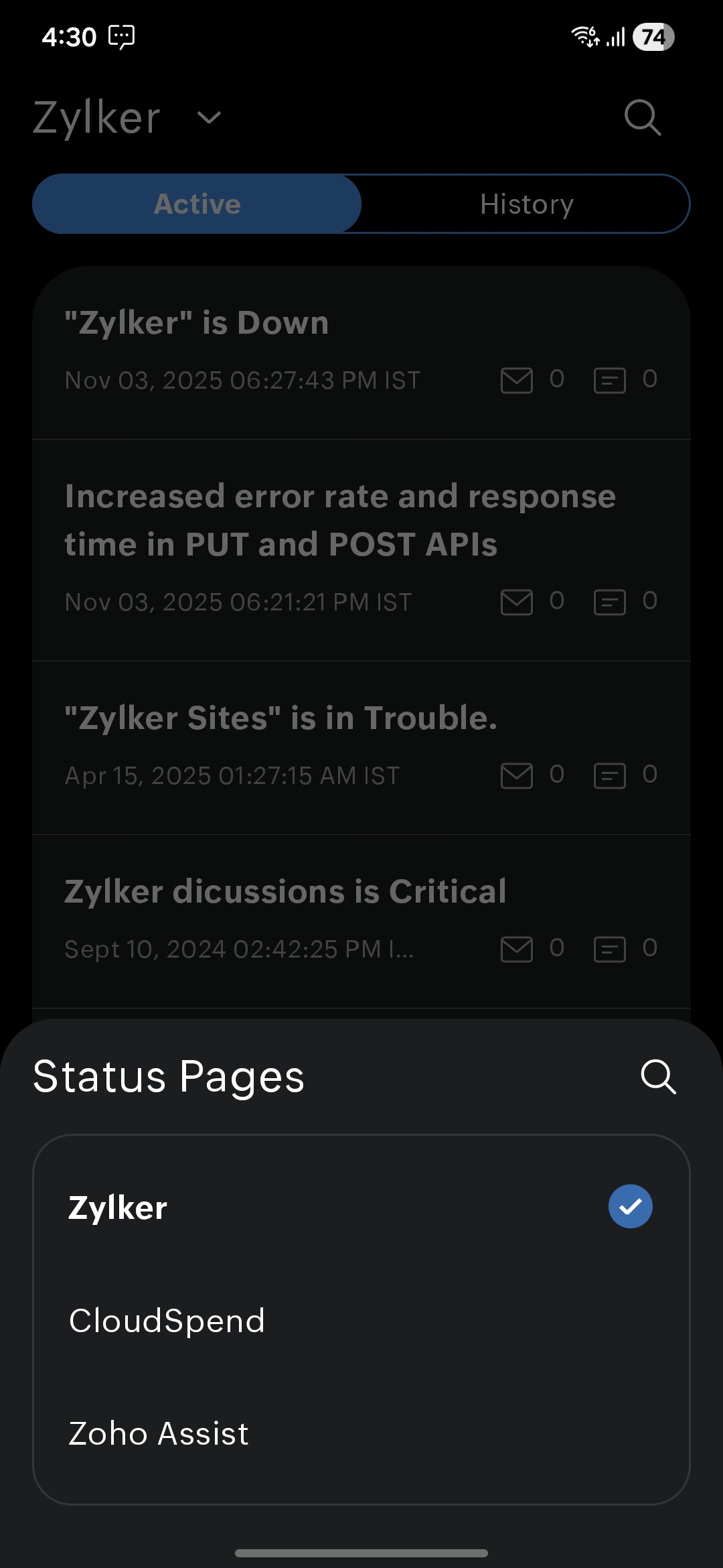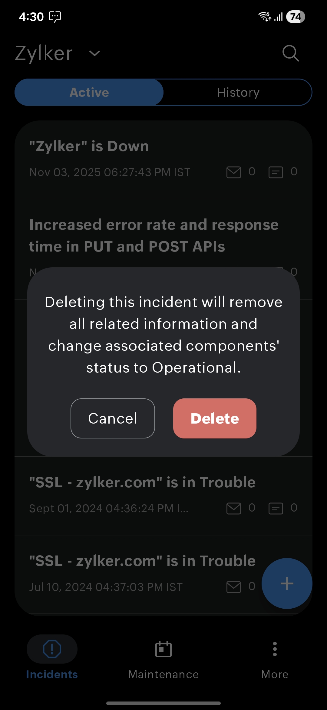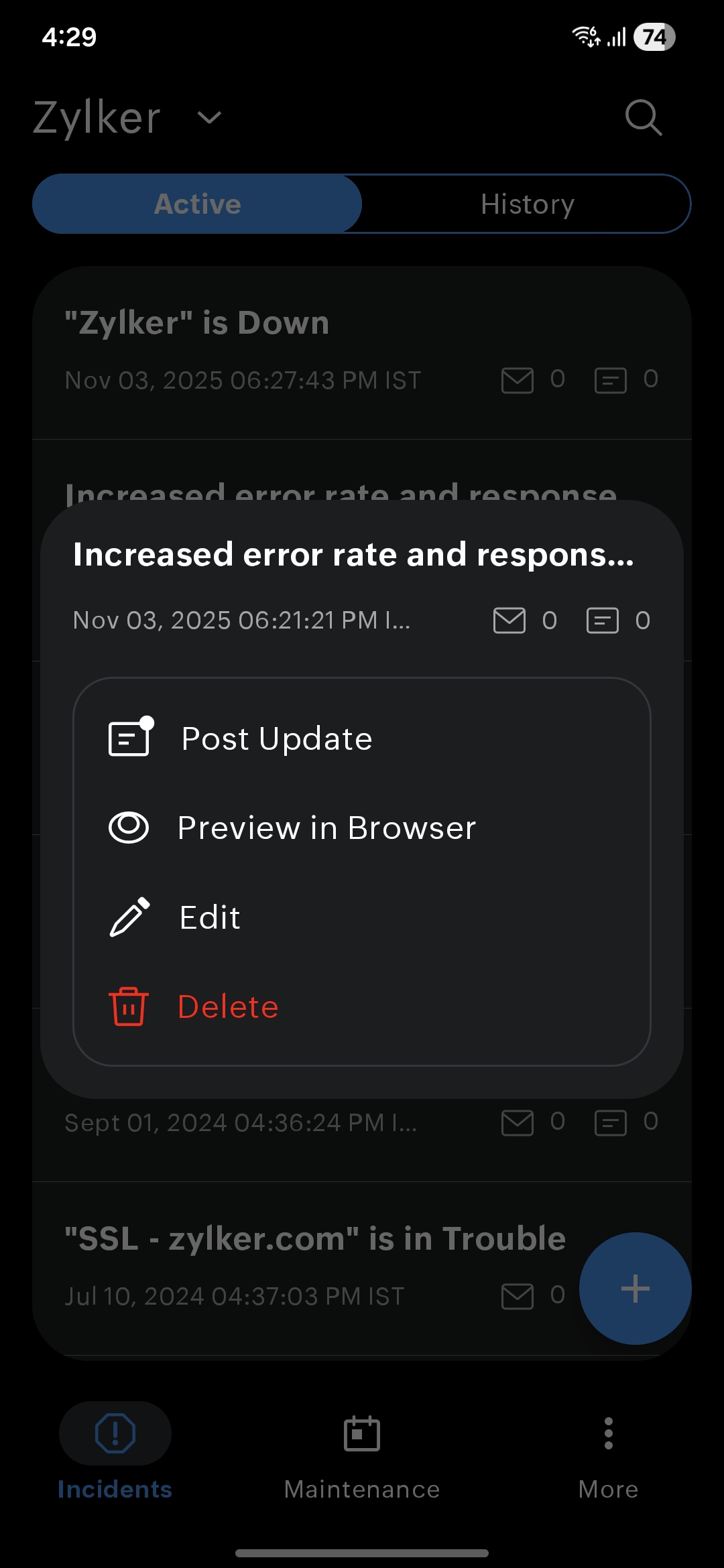 Site24x7's StatusIQ ensures clear and transparent communication by allowing technicians to provide real-time updates on incidents. The StatusIQ mobile app takes this a step further, delivering instant updates directly to your fingertips. Even without access to a laptop or desktop, you can monitor ongoing issues, track progress, and keep your customers informed with continuous updates on your status page just with your mobile device.