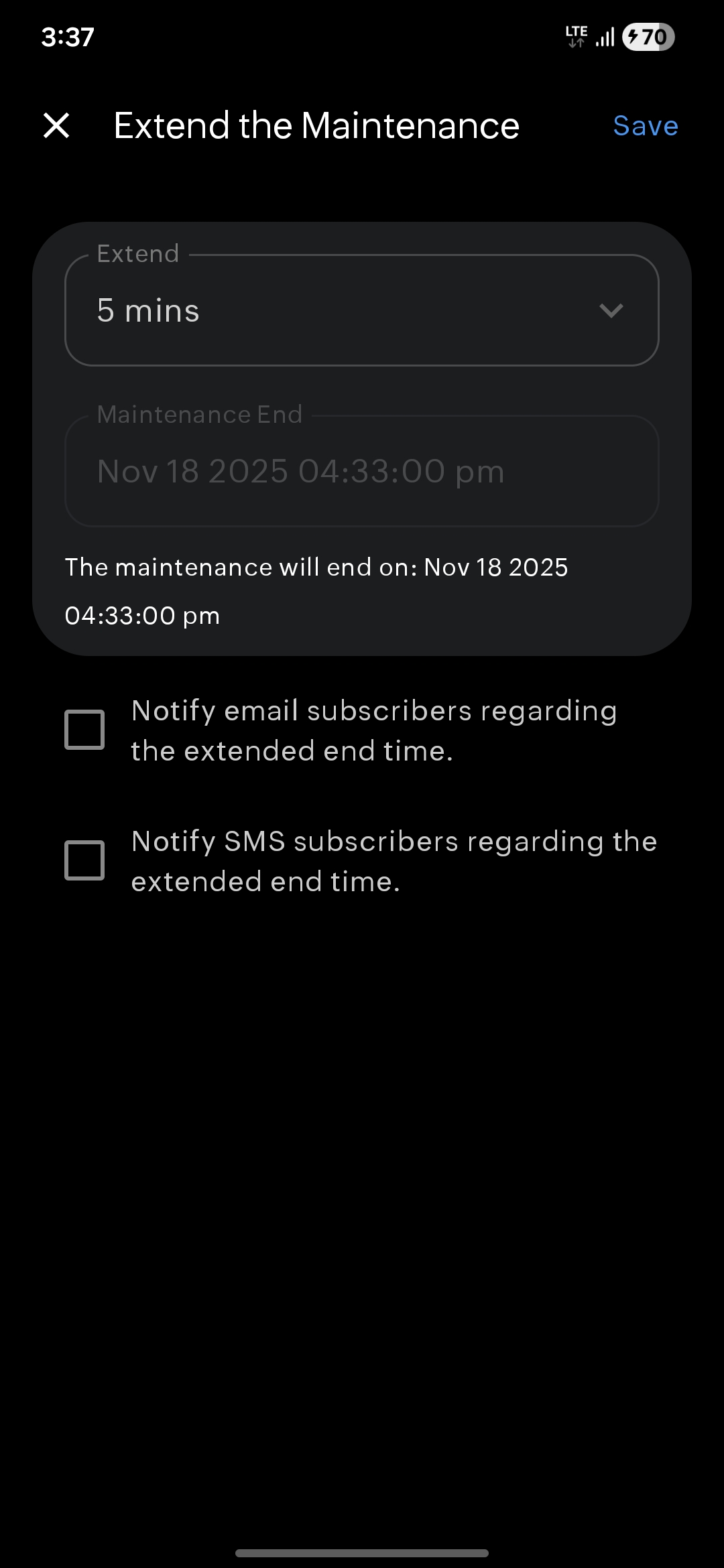 - On the Extend the Maintenance screen, specify how long you want to extend the maintenance and choose whether to notify your email subscribers and SMS subscribers about the extension.
