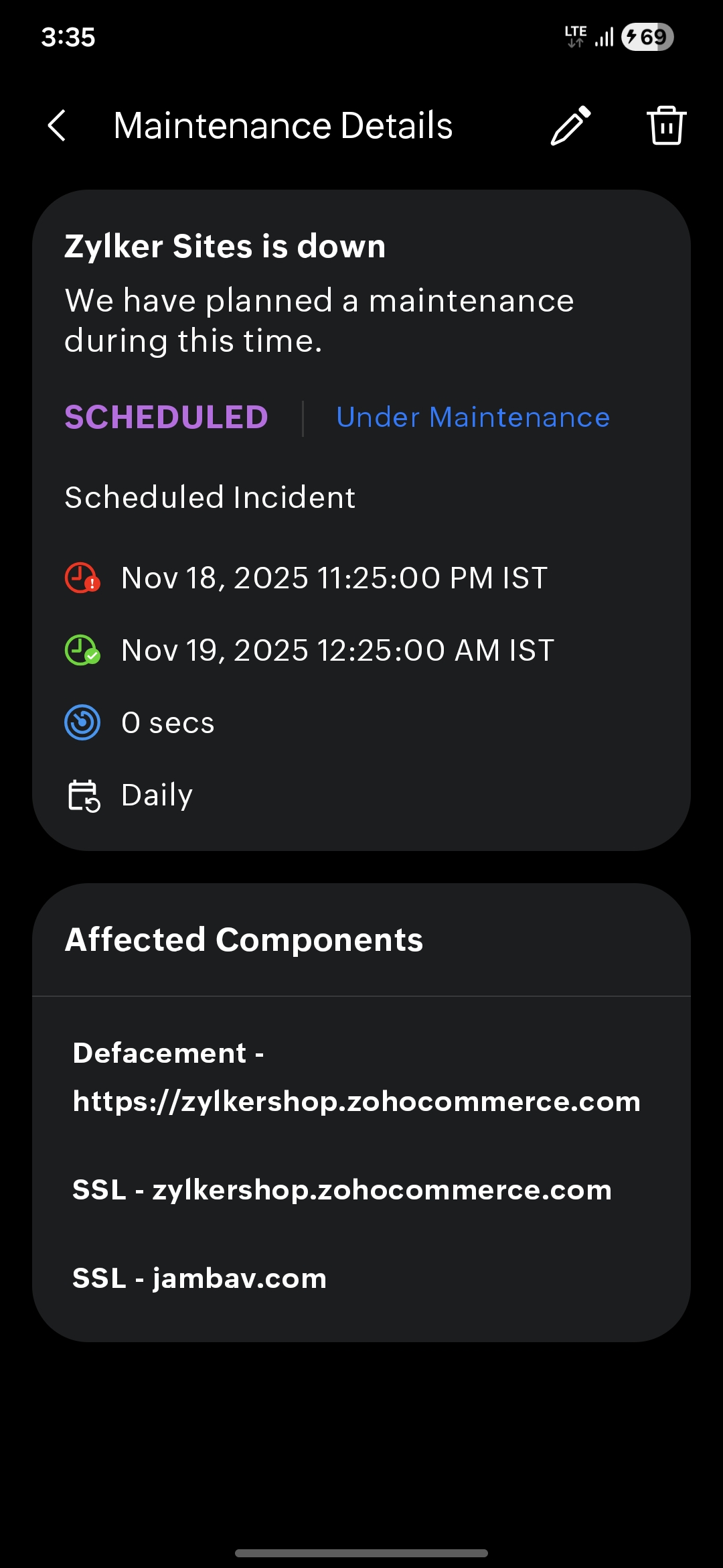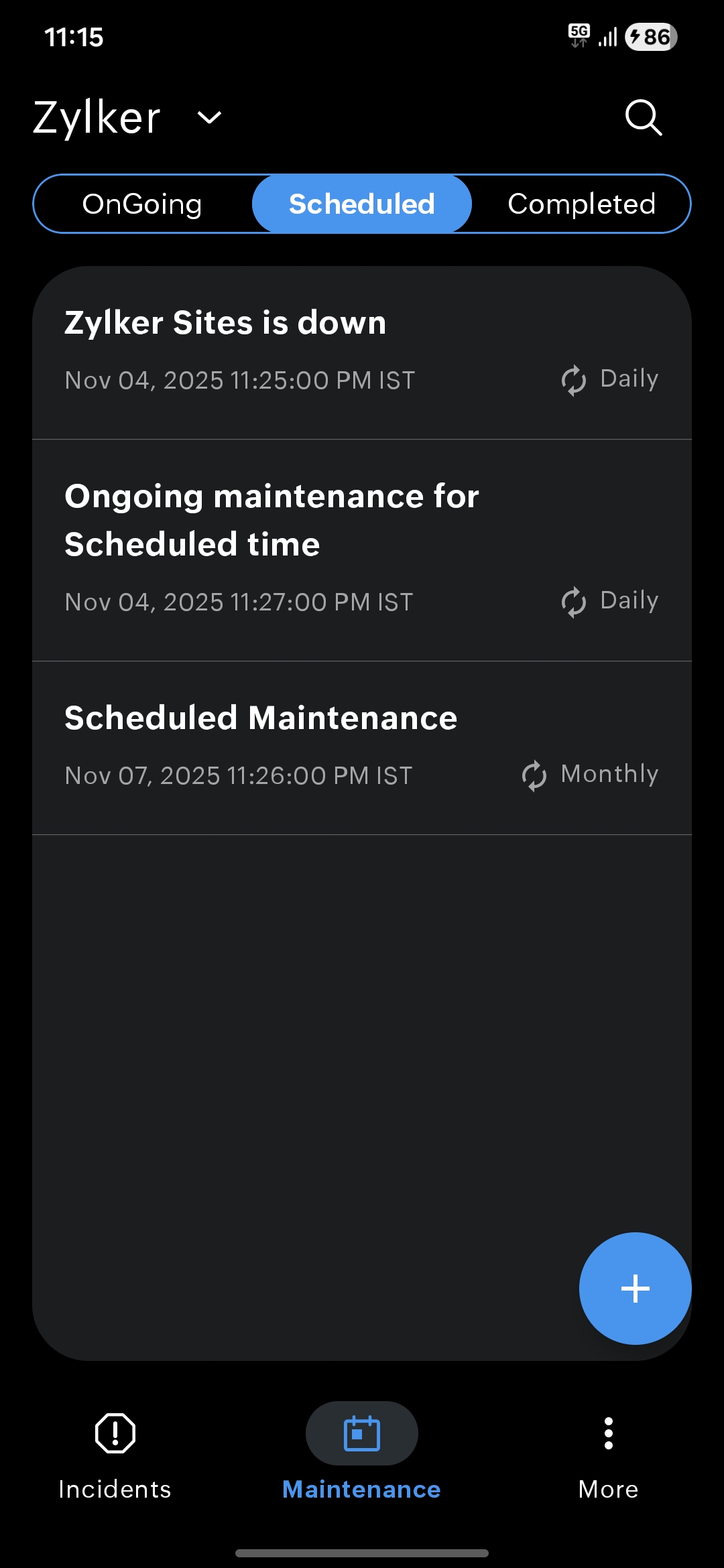 Switch to Scheduled tab to view the list of the maintenance scheduled for your status pages. Select individual schedule title to drill down into the maintenance details.